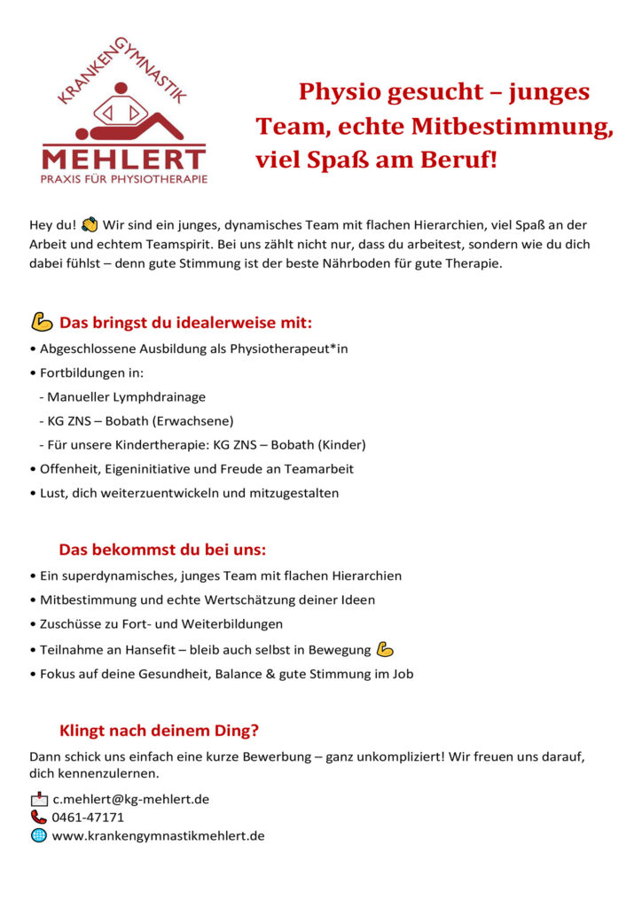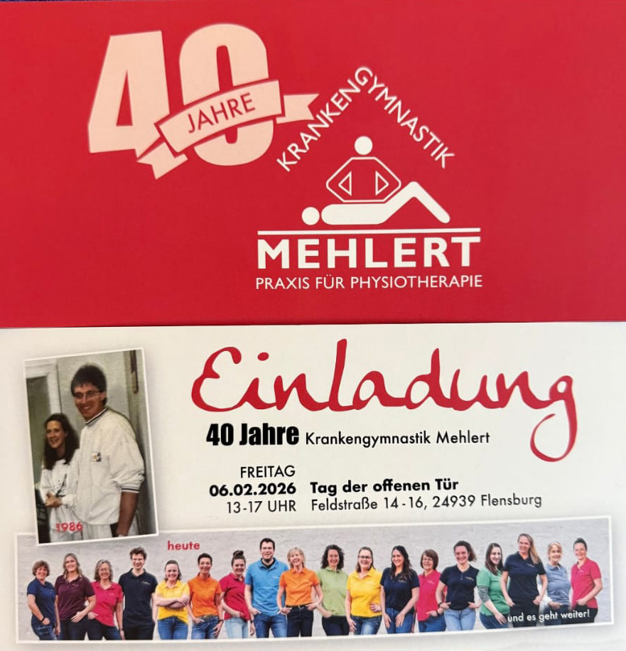 Am 01.Februar 1986 starteten Inken-Susanne und Thomas Mehlert ihre Selbstständigkeit als Physiotherapeuten in der Apenrader Straße 13. Ihre Ausbildung haben beide in Damp an der Ostseeklinik unter der Leitung von Professor Schoberth gemacht und dann ihr Wissen und die praktischen Fähigkeiten in Bonn, Köln und wieder in Damp gefestigt. Die Anzahl der Mitarbeiter nahm zu und nach zwei Jahren waren die Praxisräumlichkeiten zu klein. Der Umzug in die Neustadt 52 fand im Mai 1988 statt.